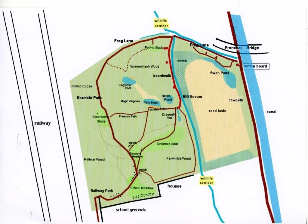 seven acres in area, between the Oxford Canal to the East, the railway to the West, the Waterways Estate to the north and the Aristotle Lane Estate to the south. Access is obtained from the canal towpath along Frog Lane, a footpath leading westwards, immediately south of the Frenchay Road bridge.